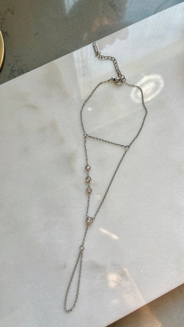 Minimalist tasarımlı, zincir detaylı ve sade süslemelere sahip gri tonlarında kadın el zinciri, günlük kullanıma uygundur. ✨