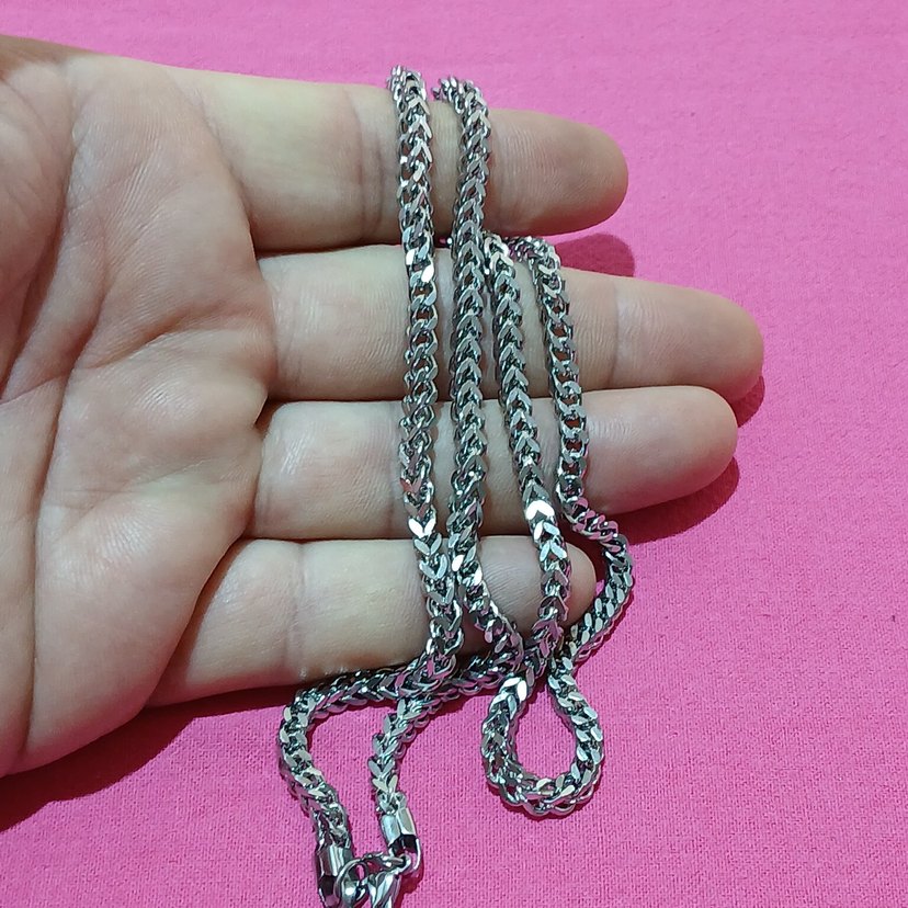Minimalist tasarıma sahip erkek zincir kolye, sağlam kilit ve parlak gümüş zinciriyle renkli pembe zemin üzerinde sunuluyor. Rock punk ve karşı kültür havası taşıyor. 65 cm 5 mm
