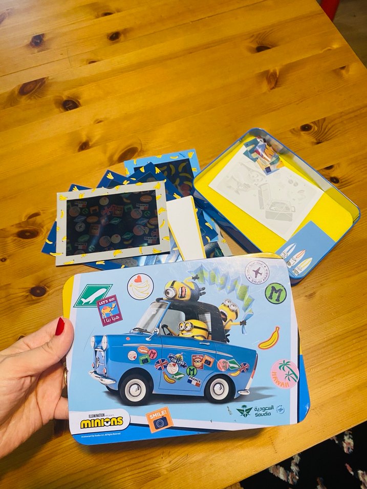 Mavi arabada Minions karakterleri bulunan renkli çocuk puzzle'ı, eğlenceli ve dikkat geliştirici bir aktivite sunar koleksiyonluk metal kutu .