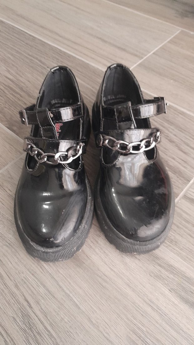 31-32 numaradır. Parlak siyah kauçuk kız loafer ayakkabılar, tokalı kayışlar ve zincir detayıyla rock punk tarzı için uygun. ön taraflarında hafif soyulmalar mevcut