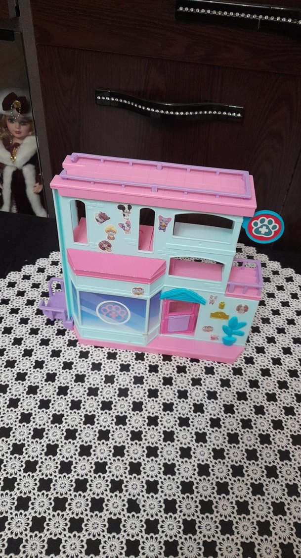 Pastel pembe ve mavi renklerde, çeşitli odaları ve dekoratif çıkartmaları olan oyuncak ev. temizdir balkonu asansorludur yukarı inip cikiyor