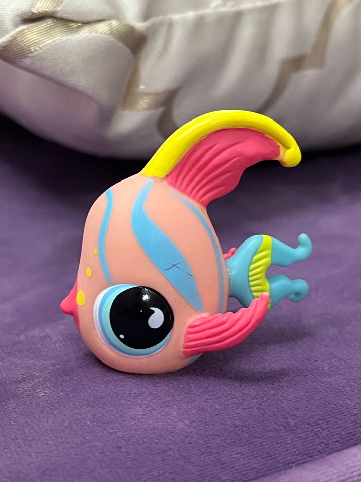 Canlı pembe gövdeye sahip, mavi ve sarı detaylı renkli aksiyon figürü. Büyük gözleri ve detaylı yüzgeçleri bulunur. #Miniş