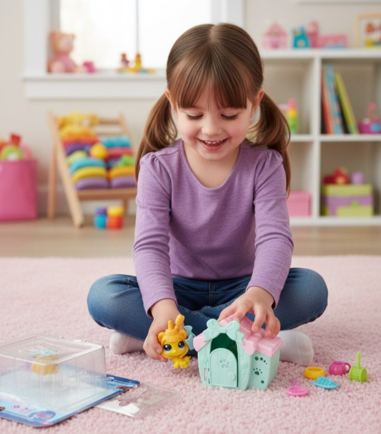 Pastel pembe renkte, küçük bir ev ve sevimli bir hayvan figürü içeren eğitici oyuncak seti, çocukların oyunla öğrenmesini sağlar.