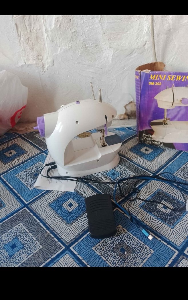 MINISEWI SM-202, beyaz renkte, ayak pedallı, temel dikiş işleri için uygun mini dikiş makinesidir.