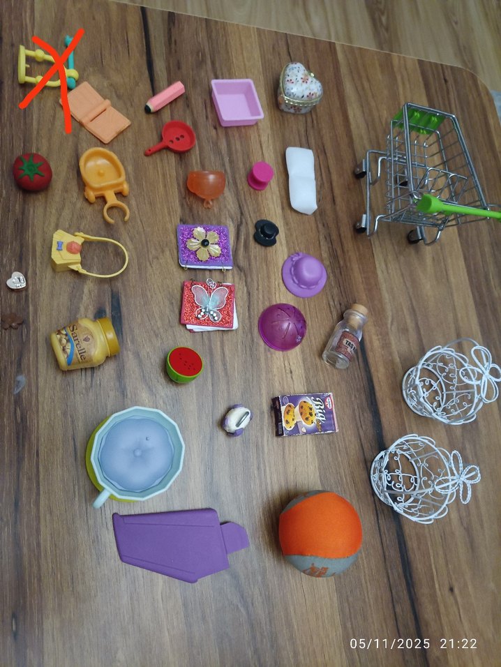 Minişler küçük parçalar ve alışveriş arabası içeren renkli mini oyuncak seti.