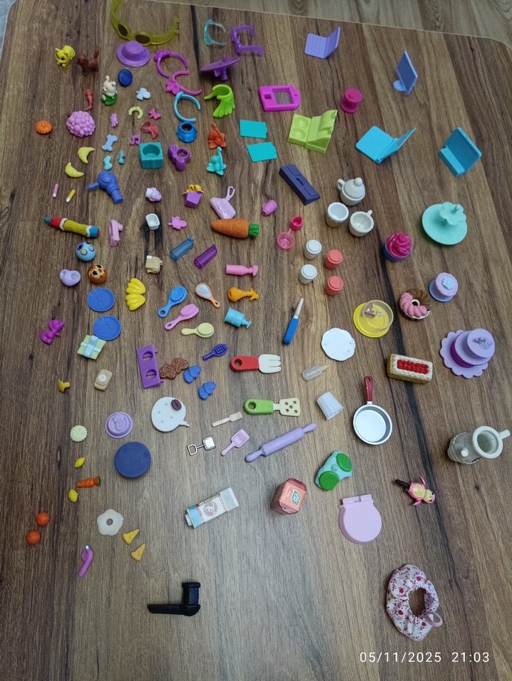 Minişler oyuncak aksesuarlar, mutfak ve yiyecek temalı parçalar içerir. Çatal, tabak ve minyatür yiyecekler bulunur. Fiyat sorup ilan açtırınız.