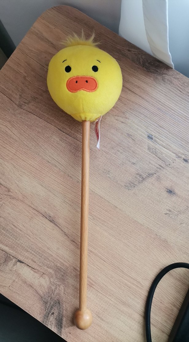 Miniso Yumuşak peluş sarı civciv ve ahşap çubuklu renkli oyuncak.