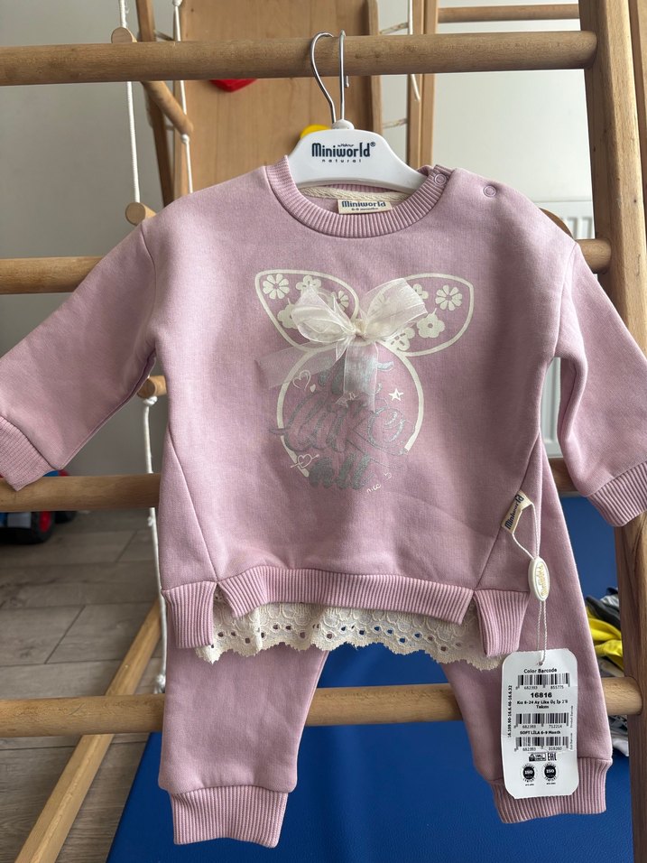 Miniworld kız bebek takımı, uzun kollu, pastel pembe renkte, baskılı ve dantel detaylıdır. Yumuşak kumaş, fiyonk ve çiçek desenleriyle süslenmiştir.