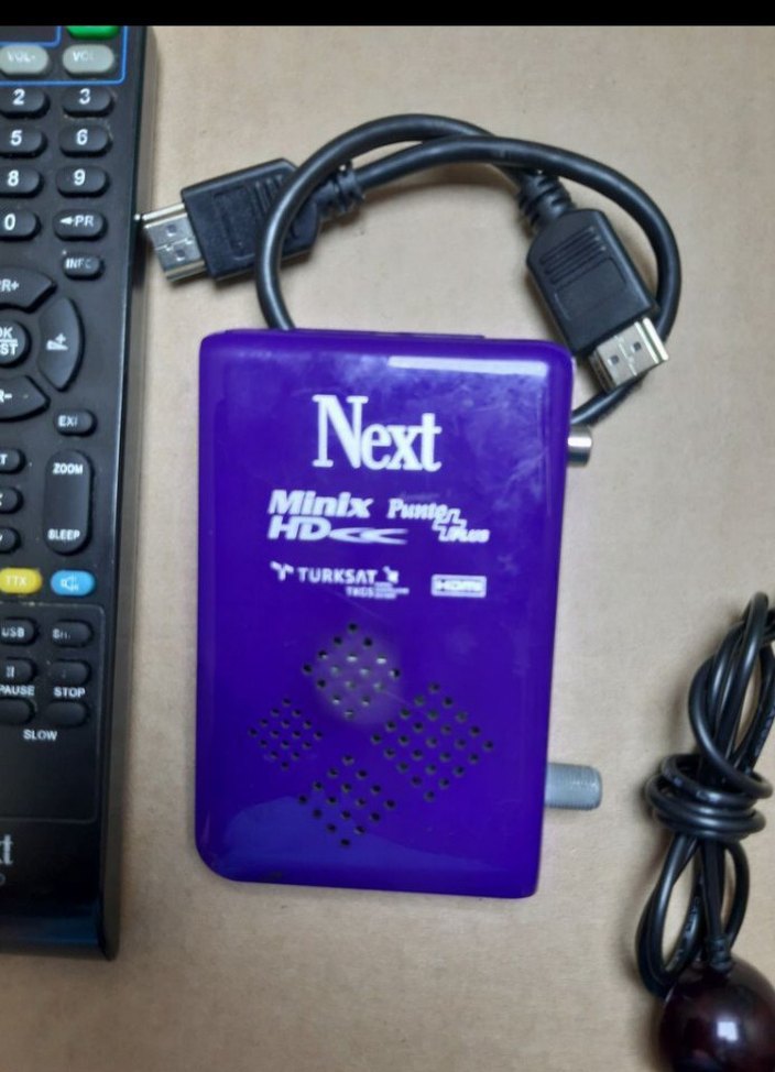 Minix HD uydu alıcısı, kumanda ve güç adaptörü ile birlikte gelir, net HD sinyal alımı sağlar. fazlaliktan satlik