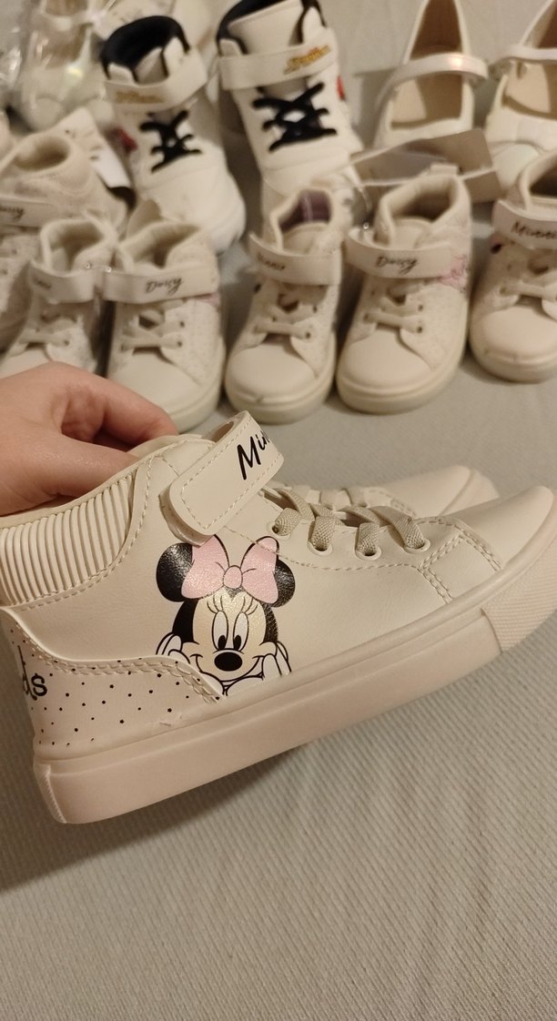 Beyaz renkte, Minnie Mouse baskılı kız çocuk spor ayakkabısı. Kauçuk tabanlı ve cırt cırtlı kapanışlıdır. Hafif renkli, sokak stili için uygun.
