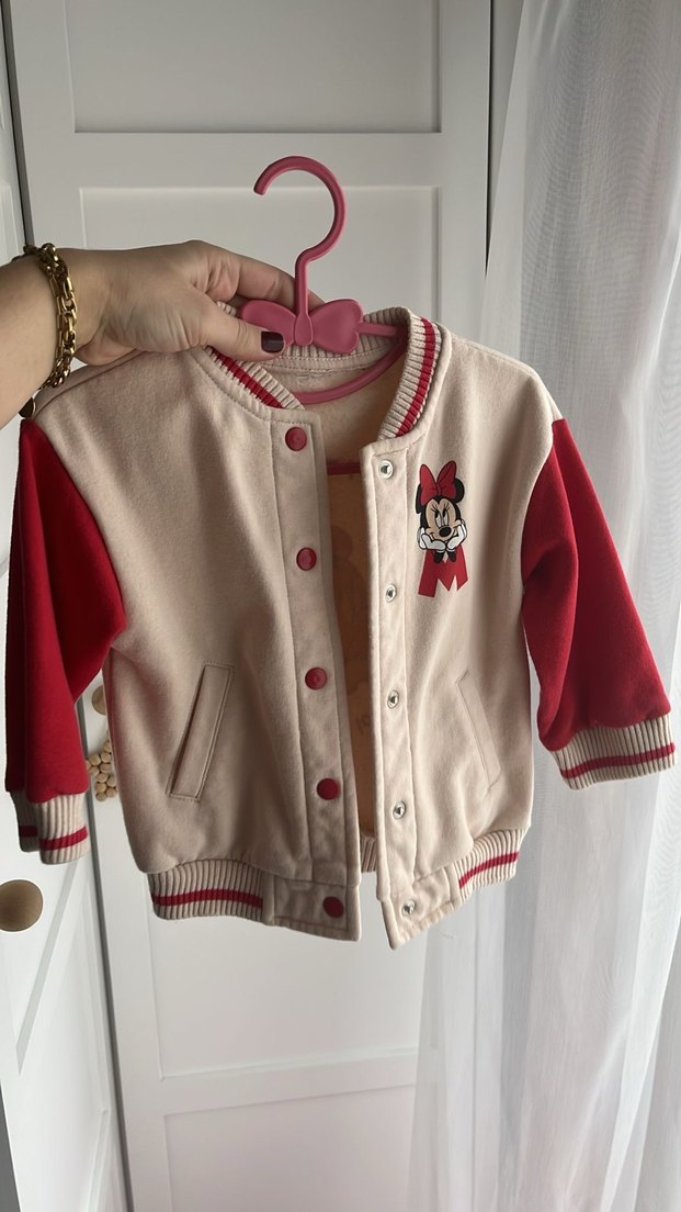 Düğmeli, bisiklet yaka ve baskılı Minnie desenli,kırmızı renklerde, yumuşak ve sıcak kumaştan yapılmış kız çocuk ceket.