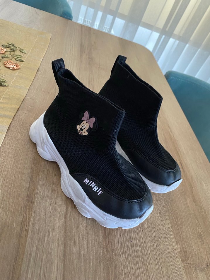 Siyah Minnie baskılı kız çocuk spor ayakkabısı, cırt cırtlı ve kauçuk tabanlı, şık sokak stili için uygun.