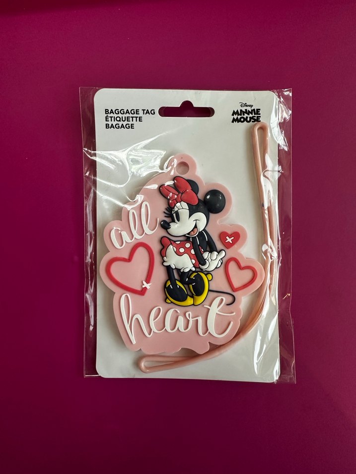 Minnie Mouse figürlü ve kalp desenli esnek renkli bagaj etiketi.