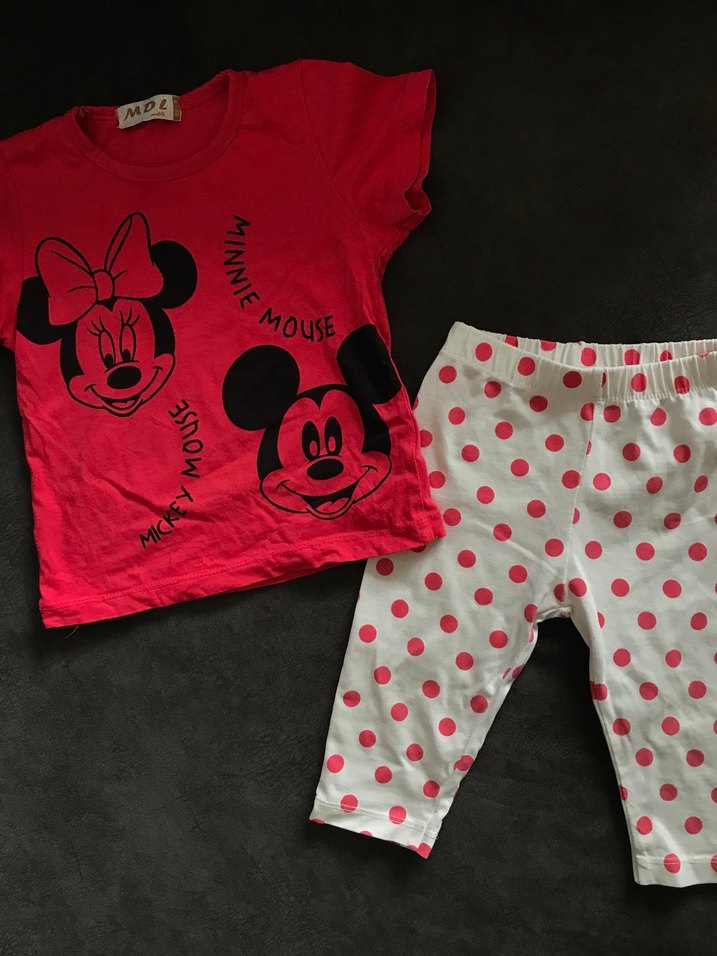 Renkli, kısa kollu üstte Minnie ve Mickey Mouse baskıları, beyaz pembe puantiyeli taytlı bebek kız takımı.