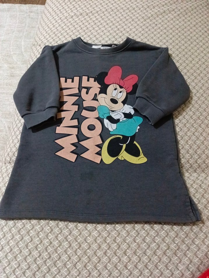 Gri renkli, uzun kollu, bisiklet yaka ve bol kesim kız sweatshirtü. Sentetik kumaştan örülmüş ve Minnie Mouse baskılıdır. Trend sokak stili için uygundur.