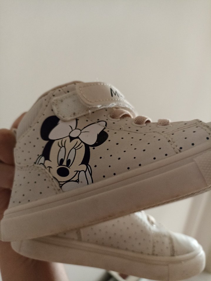 Beyaz, parlak yüzeyli kız çocuk spor ayakkabısı. Minnie Mouse baskılı ve kolay kullanım için cırt cırtlıdır. Kauçuk tabanlı, sokak stili için uygundur.