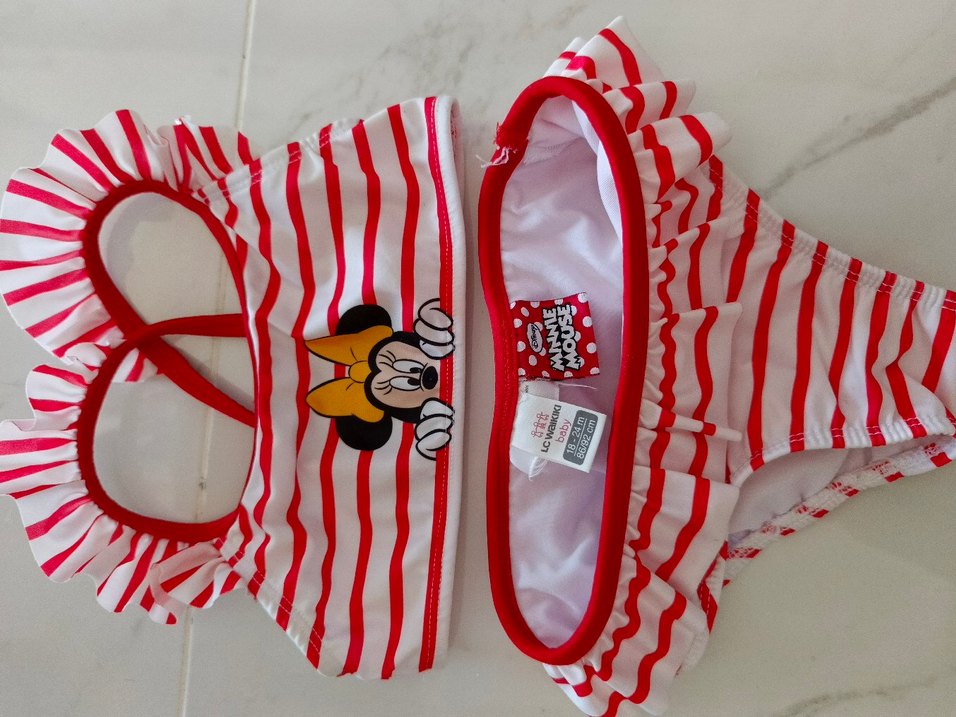 Kırmızı-beyaz çizgili, Minnie Mouse baskılı, askılı kız çocuk bikini. Plaj için uygun renkli tasarım. ️