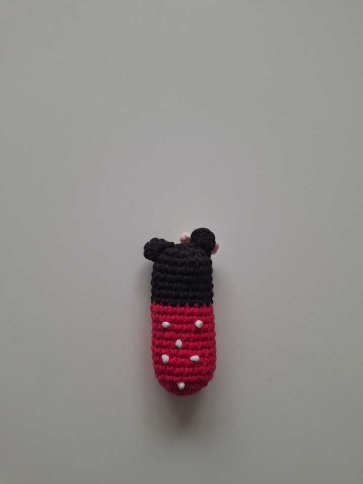 kırmızı siyah el örgüsü iplikle Minnie Mouse figürlü stres oyuncağı .Yumuşak dokusu ve çıkardığı tatmin edici çıt çıt sesiyle stresi azaltmaya yardımcı olur; el kaslarını çalıştırarak güçlenmesini destekler.