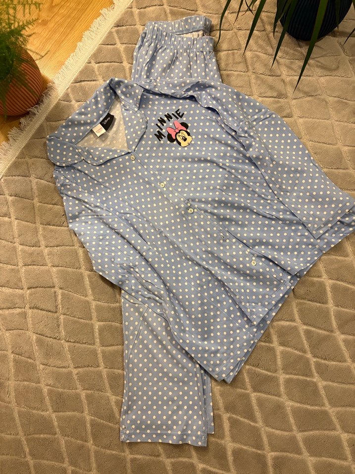 Mavi, beyaz puantiyeli ve uzun kollu gevşek kesim pijama takımı, göğsünde Minnie Mouse işlemeli. Rahat beli lastikli altıyla konforlu bir kombin.