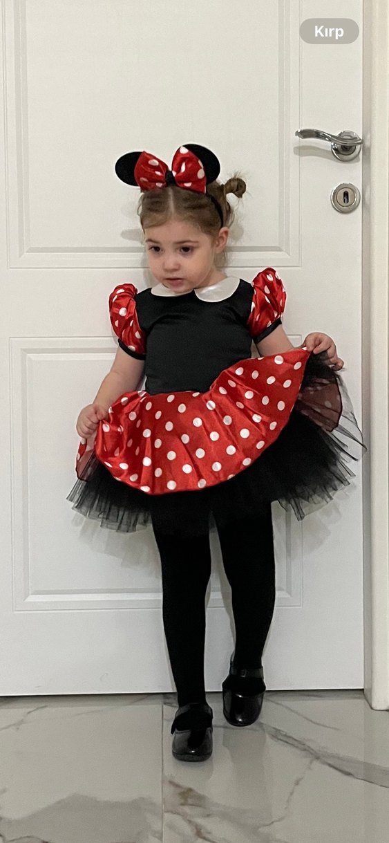 Kız çocuk için kırmızı puantiyeli fırfırlı etek ve siyah tül katmanlı, kısa kollu, dar kesim sentetik kumaştan elbise. Pan kostümden alınmıştır şuanki fiyatı 4.000 tldir. Çok az giydi evde 1 saat bile durmadı üzerinde . Elbise 2 yaş ama ben 3 yaş doğum gününde giydirdim . 2-3 yaş için uygundur.
