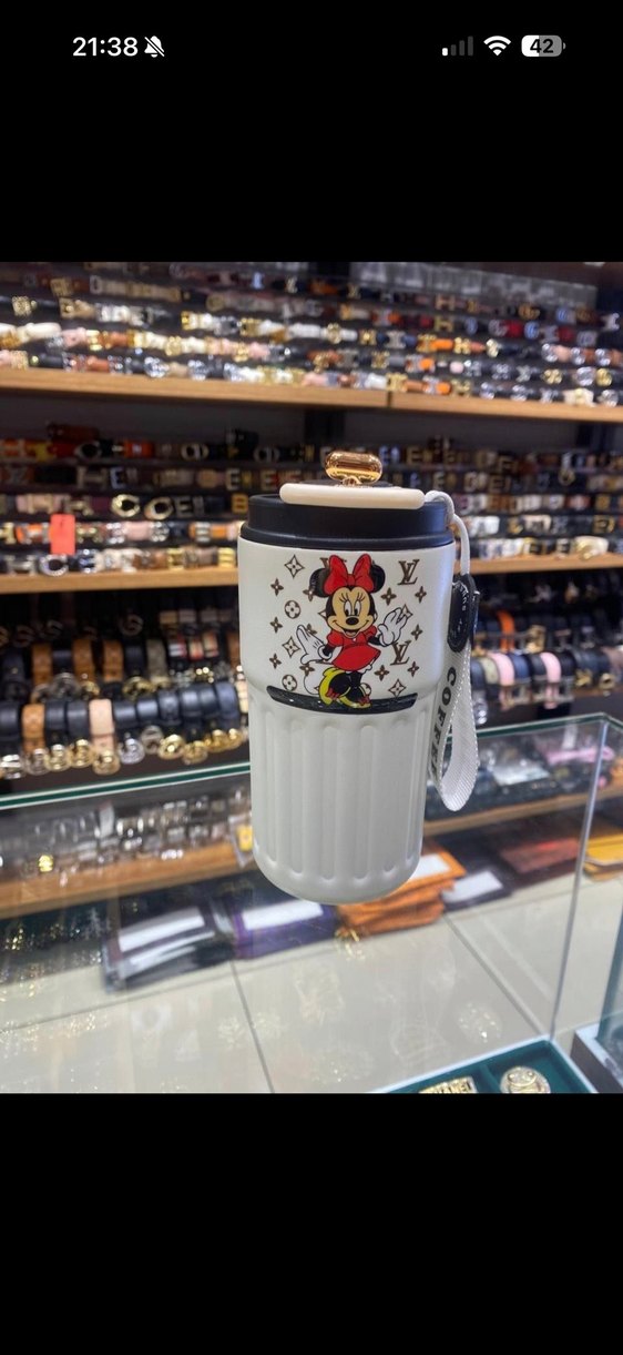Ön yüzünde renkli Minnie Mouse tasarımı bulunan beyaz renkli kupa. Kolay taşınması için kapak ve bileklik kayışı içerir. ☕