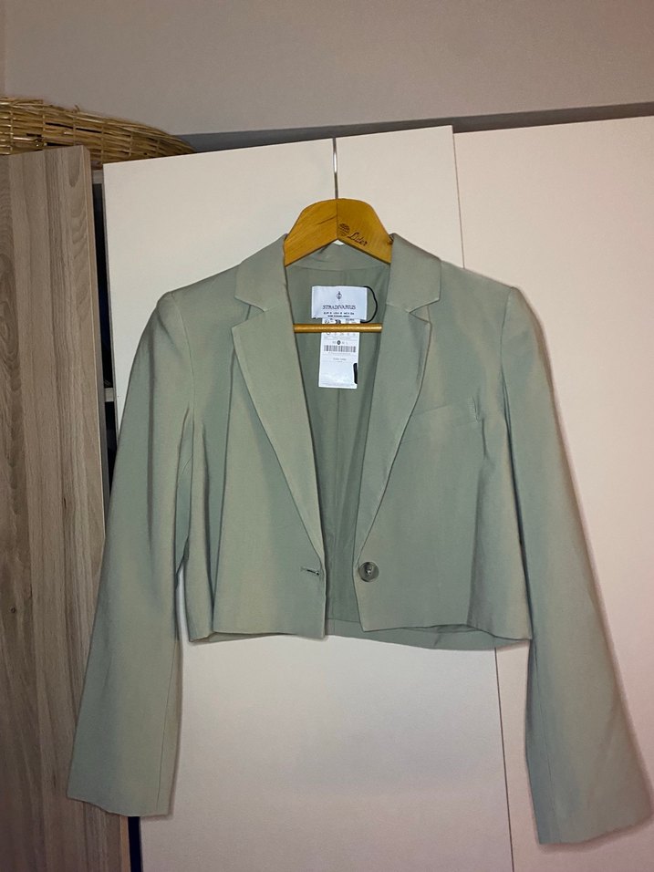 Mint crop blazer sıfır, normal kesim ve midi boyda, klasik yakalıdır. (Uygun tekliflere dönüyorum)