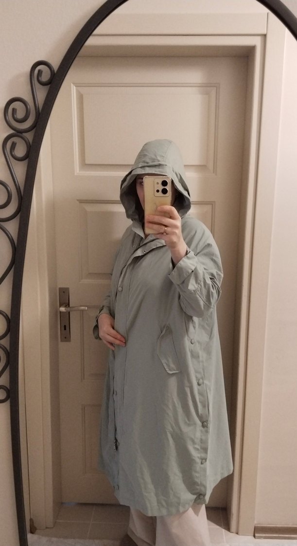 mint renkli, midi boy, bol kesim, yüksek yakalı ve uzun kollu kadın yağmurluğu. Sentetik kumaştan, şeffaf görünümlü, günlük kullanım için uygun.