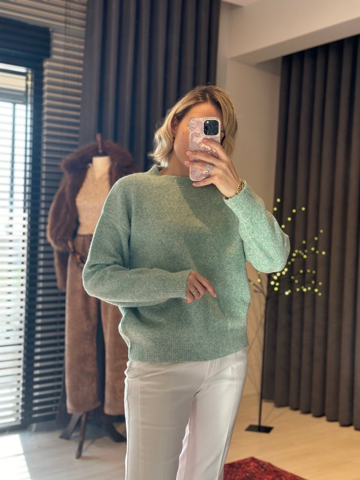 Pastel mint renkli, örgü dokulu, bol kesim, yuvarlak yaka ve uzun kollu midi uzunlukta kadın kazak. Günlük rahat kullanım için yumuşak dokulu şık ve spor stiline uygun. Standart beden.