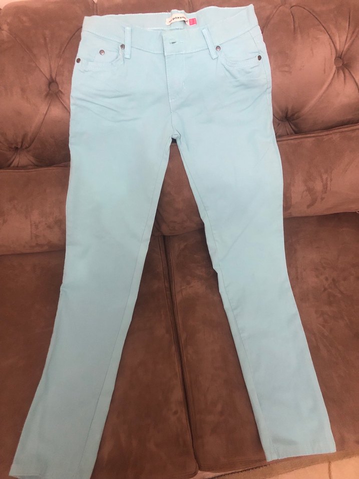 Mint pastel renkte, midi boyda, rahat kesim kadın denim pantolon. Sokak stiline uygun, desen içermeyen ve şık bir görünüm sunar.