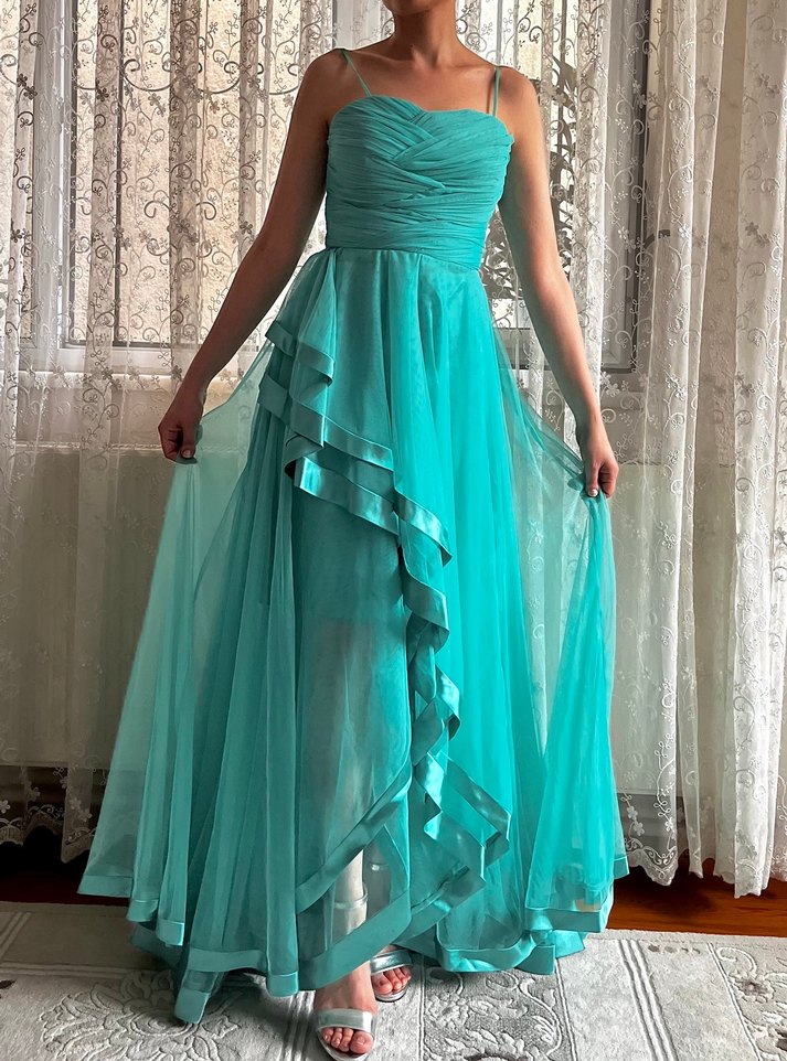 Mint renkli abiye. Askılarını alıp ben diktim. Normalde straplezdi. Xs bedene göre daraltıldı.