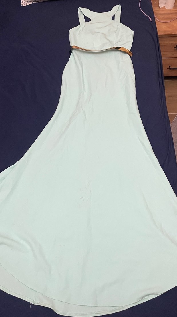 Mint yeşil, straplez ve drapeli detaylara sahip bu uzun abiye, minimalist ve çağdaş bir tarz sunar, düğünler için uygundur.