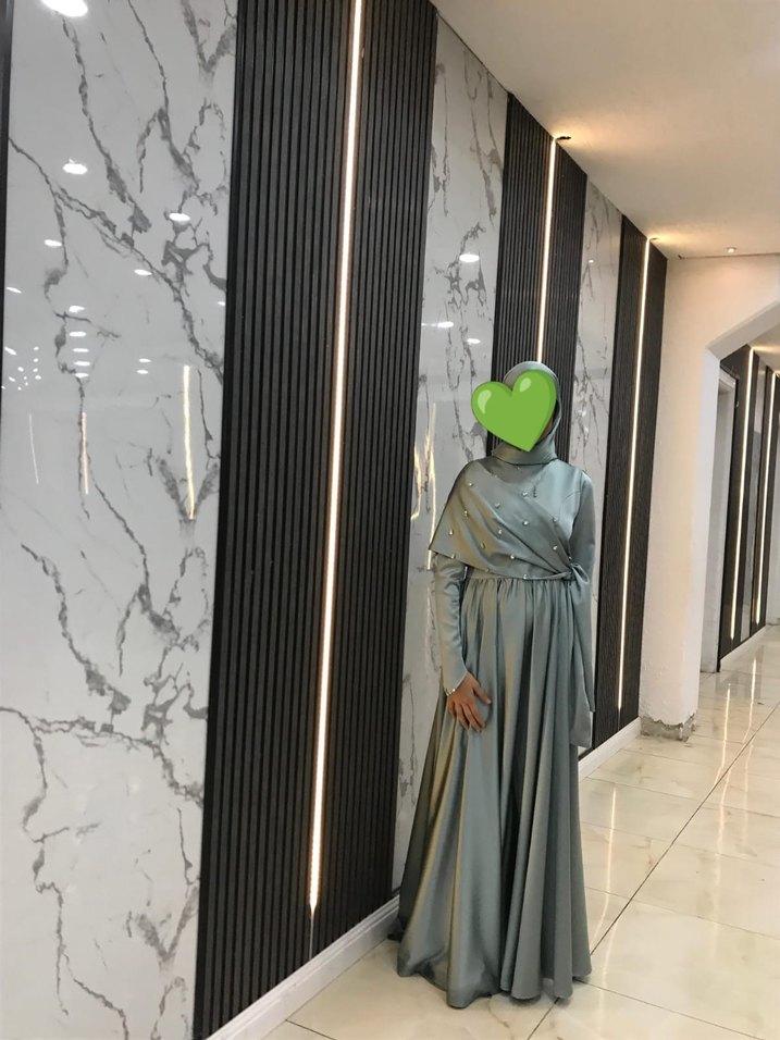 Drapeli, uzun ve fitted kesime sahip mint yeşili abiye elbise, yüksek yakalı ve uzun kollu. Düğünler için uygun, modern ve avangart tarzda, modest görünüm sunar.