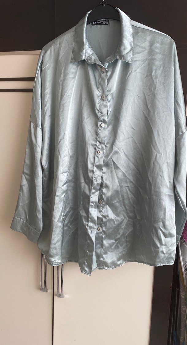 Mint yeşili renkte, ipek görünümlü kumaştan yapılmış, düğmeli ve uzun kollu, bol kesim kadın gömlek. Midi boyda ve yakalı, bohem Paris tarzını yansıtan rahat bir model.