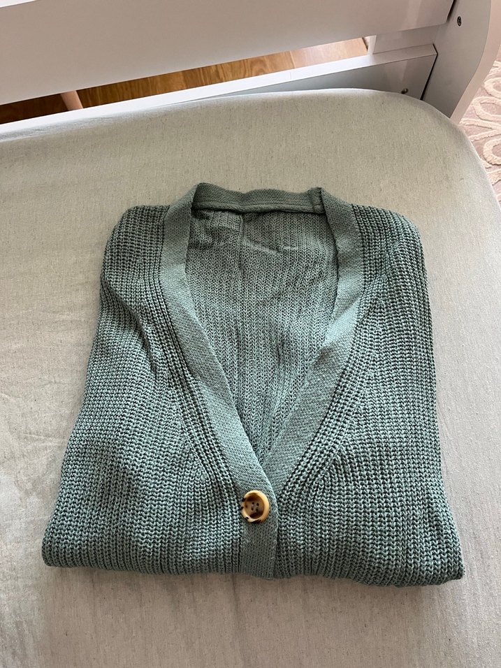 Mint yeşili renkli, düğmeli ve V yakalı triko hırka. Uzun kollu, bol kesim ve midi boyda, rahat ve şık bir günlük tercih. Bazı yerlerde pamuklanmalar var