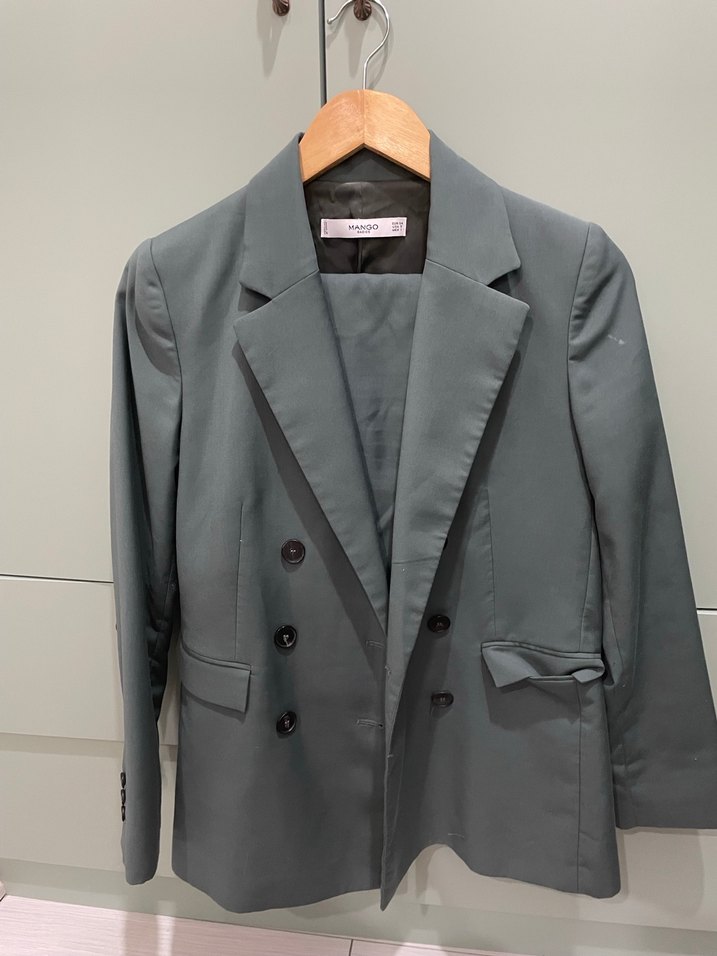 Mint renkli, düğmeli ön kısmı ve yaka detayı olan, sentetik kumaştan yapılmış, midi boy ve normal kesim kadın blazer ceket. Ofis için uygundur. Takım olarak satıyorum . Bedeni olmadığı için satıyorum . Pantolonu havuç model ve boy olarak biraz kısa. Sadece ceket düğmelerinde bit renk aşınması olmuş onun dışında kusursuz