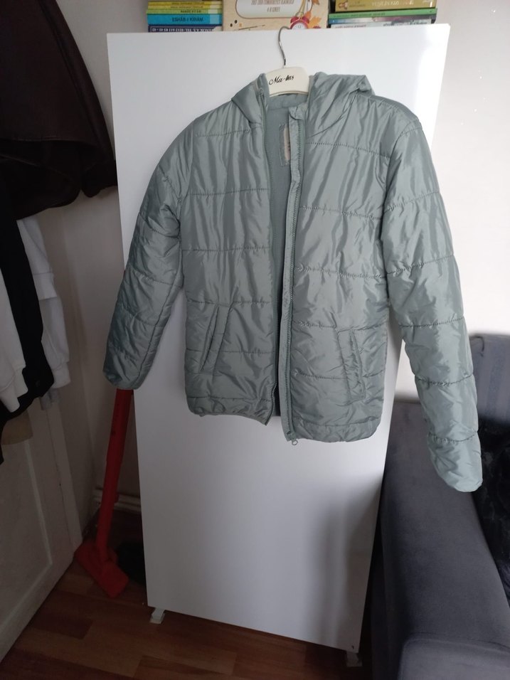 Mint yeşil renkli, kısa kesim ve uzun kollu kadın mont. Fermuarlı önü ve minimal tasarımıyla dış mekan kullanımı için uygundur. Yumuşak ve sıcak dokusu vardır. 14.15yaş