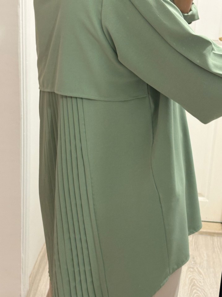 mint yesili renkli, yüksek yakalı ve uzun kollu midi tunik, yumuşak sentetik kumaştan üretilmiş bol kesimdir. Minimalist ve desensiz yapısı günlük kullanıma uygundur. Arka kisminda detayli
