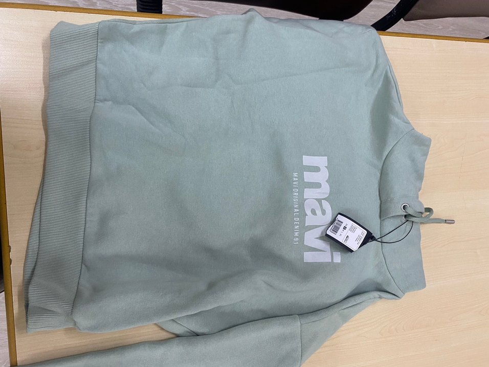Mint yeşili kapüşonlu sweatshirt, rahat kesim ve uzun kollu. Yumuşak sentetik kumaştan, önünde 'mavi' baskısı bulunan spor tarzda bir parça. ♀️