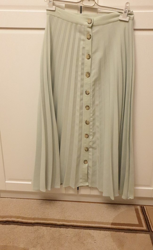 mint yeşili renkte, piliseli ve düğmeli önü olan uzun kadın etek. ic göstermez. kilo verdiğimden buyuk geldigi icin satiyorum hic kullanmadım diyebilirim