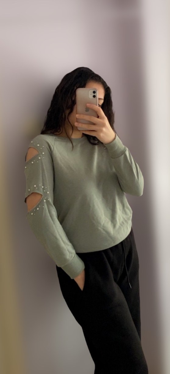 Mint yeşili renkte, uzun kollu, delikli ve inci detaylı triko kadın kazak. Salaş kesimi ve yuvarlak yaka ile günlük rahat kullanım için uygundur.