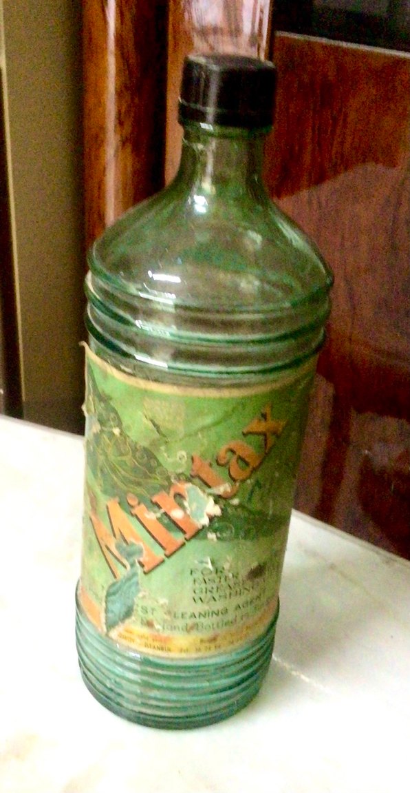 Parlak yeşil renkte, klasik şekilli ve vidalı kapaklı,Mintax Türkiye için üretilmiştir ibareli çok eski deterjan şişesi