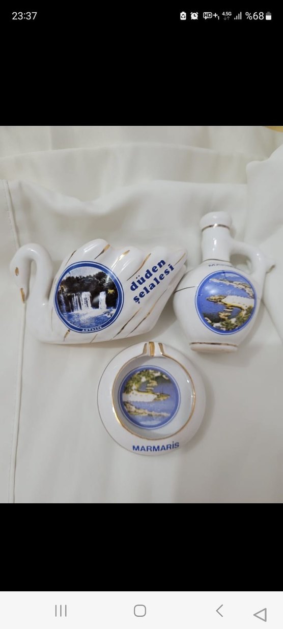 50 senedir bizde vitrinde duruyor. marmaris'ten hediye olarak alınmış. porselen minyatür şeklindeler kül tablası 5-6 santim. şekerlik 8-10 santim. vazosu 7 8 cm arasındadır.