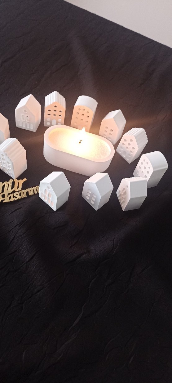ortadaki oval mum ve etrafındaki küçük ev şeklindeki mumluklarla sıcak bir atmosfer yaratır. ️istenilen ürüne göre yeni ilan açıyorum
