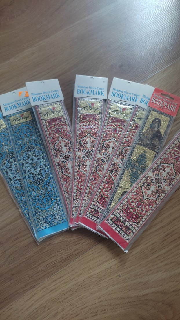 Detaylı desenlere ve canlı renklere sahip minyatür halı desenli kitap ayraçları. Kitap sayfalarını işaretlemek için kullanılır.