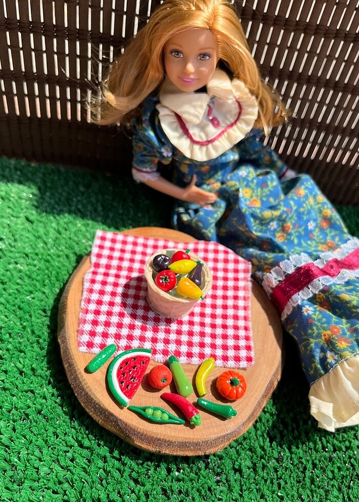 Minyatür oyuncaklardır. Mini meyve seti içeriğinde görseldeki 15 çeşit meyve, 1 adet sepet, 1 adet piknik örtüsü bulunmaktadır. Meyveler 0.9-2.5 cm boyutlarındadır. Sepet çapı 3 cm’dir. Barbie, Sylvanian Families, Lego Duplo, Miniş vb için uygun boyuttadır. Görseldeki bebek ve diğer objeler fotoğraf amaçlıdır, satılık değildir.