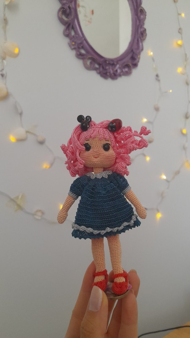 El örgüsü minyatür kişiye özel yapılır.Renkli pembe saçlı, mavi elbiseli el örgüsü bebek. Detaylı tığ işi ve küçük saç aksesuarları bulunur.