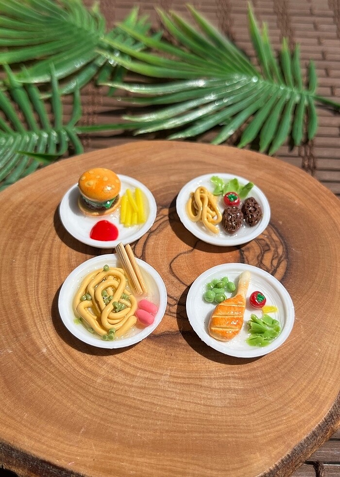 Tabak çapları 2.5 cm’dir. İlan fiyatına dahil olanlar 1 adet köfte tabağı, 1 adet tavuk butu tabağı, 1 adet noodle tabağı, 1 adet hamburger tabağıdır. El yapımıdır. Yiyecekler polimer kilden, tabaklar pla baskıdan üretilmektedir. Barbie, Sylvanian Families, Lego duplo, Lps Miniş vb oyuncaklara uygun boyuttadır.