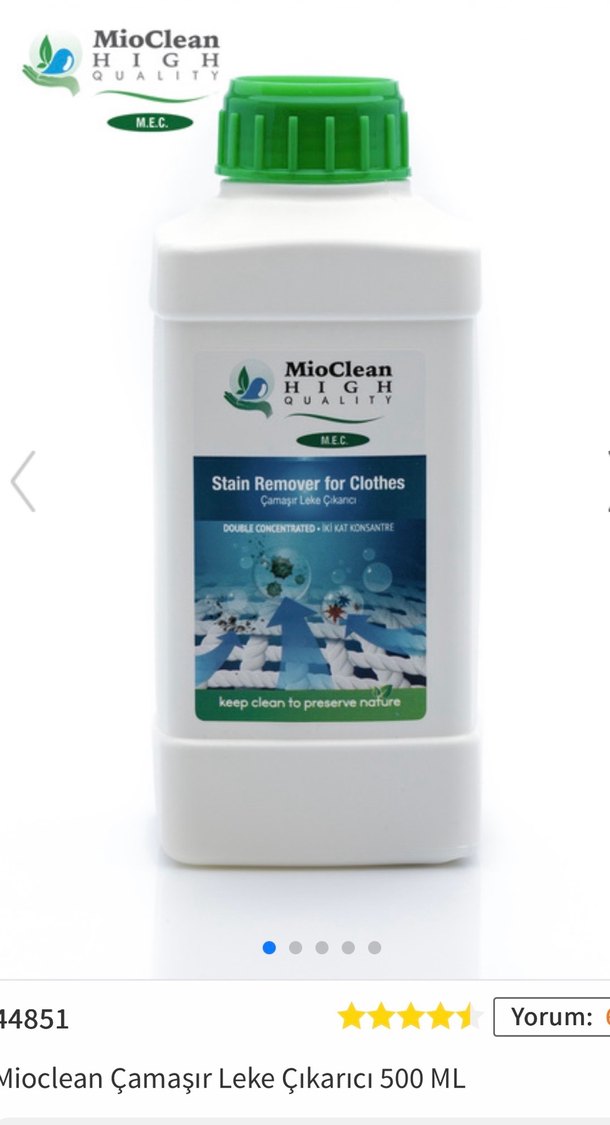 MioClean giysi lekeleri için çift konsantre leke çıkarıcı sıvı, doğayı koruyarak etkili temizleme sağlar. Beyaz şişe, yeşil kapaklı.