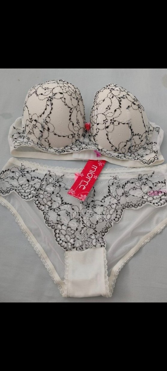 Miorre markalı sütyen ve külot takımı, beyaz kumaş üzerine siyah nakışlarla bohem tarzda tasarlanmıştır. Dolgulu sütyen ve dantel detaylı külot içerir.