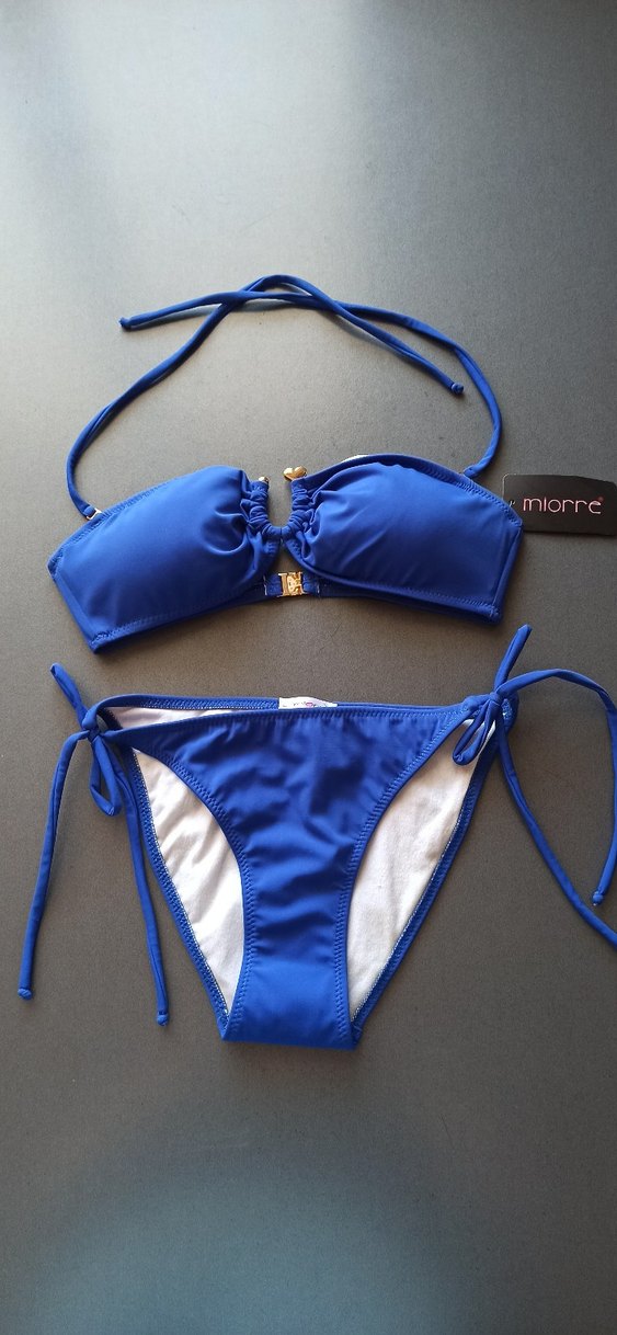 Miorre markalı, parlak mavi, strappy detaylı ve tokalı, vücuda oturan bikini. Minimalist ve desen içermeyen tasarımıyla plaj için uygun. ️